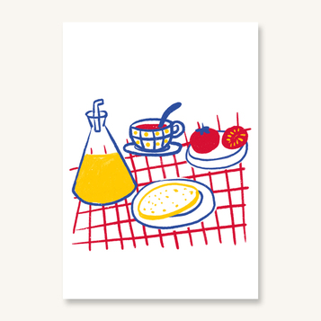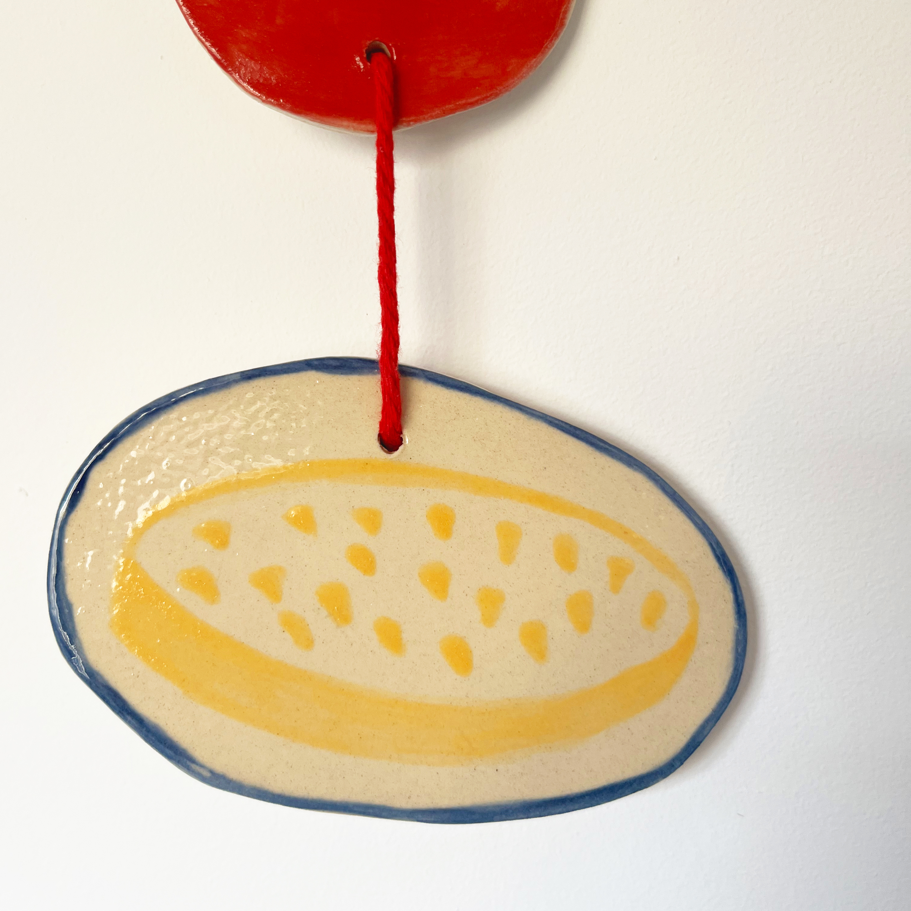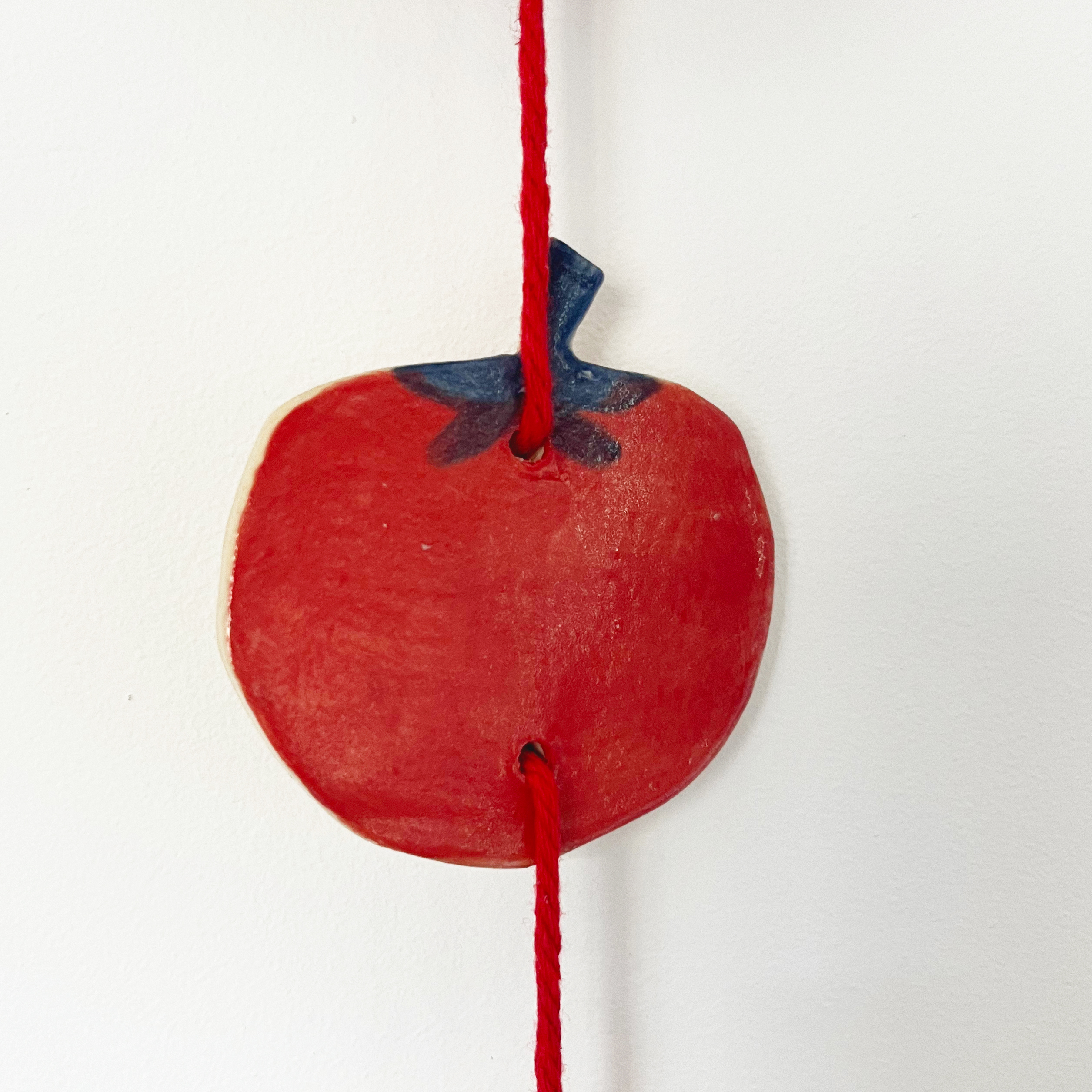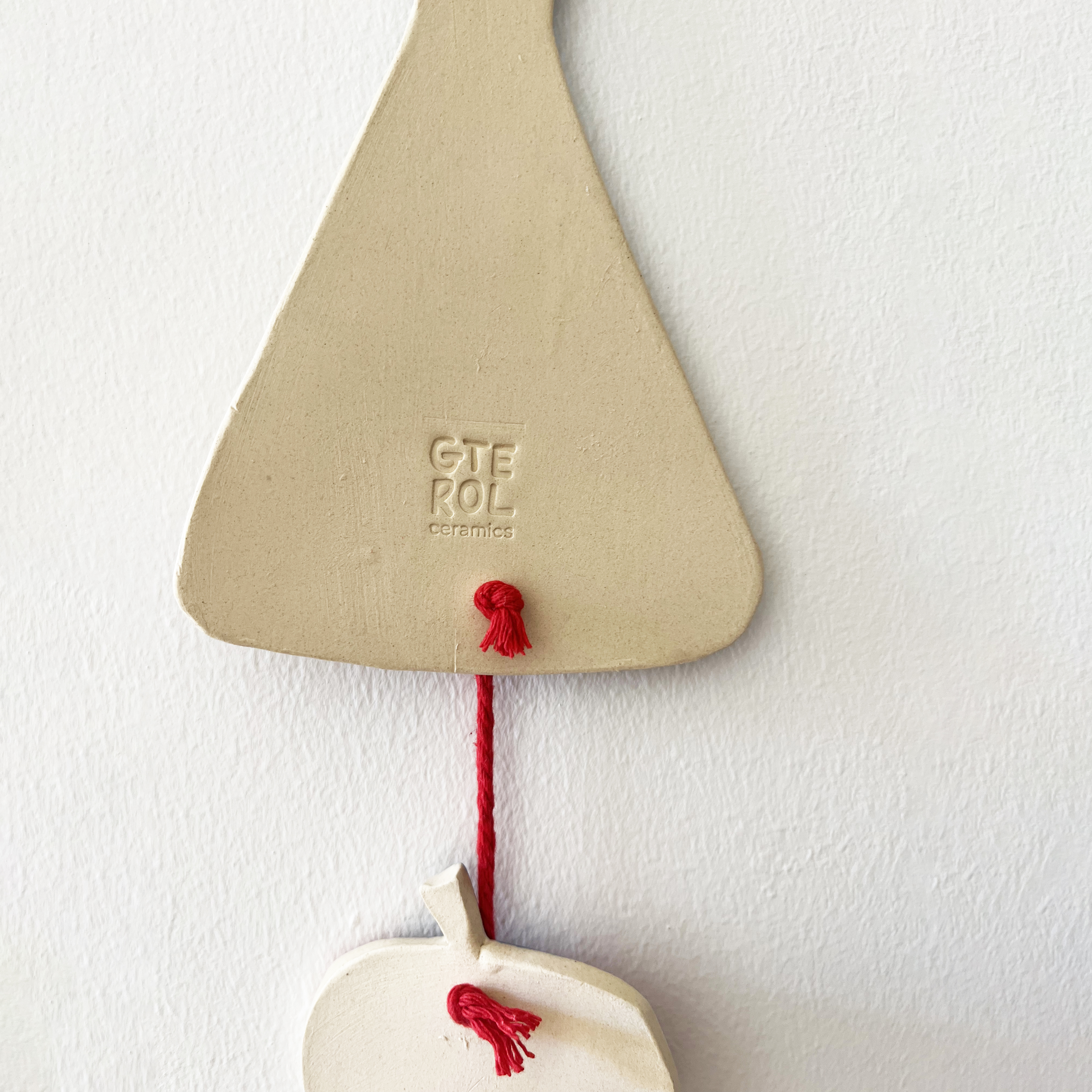 El mòbil pa amb tomàquet és una peça de ceràmica decorativa formada per tres peces: la setrillera Marquina, el tomàquet i la llesca de pa.