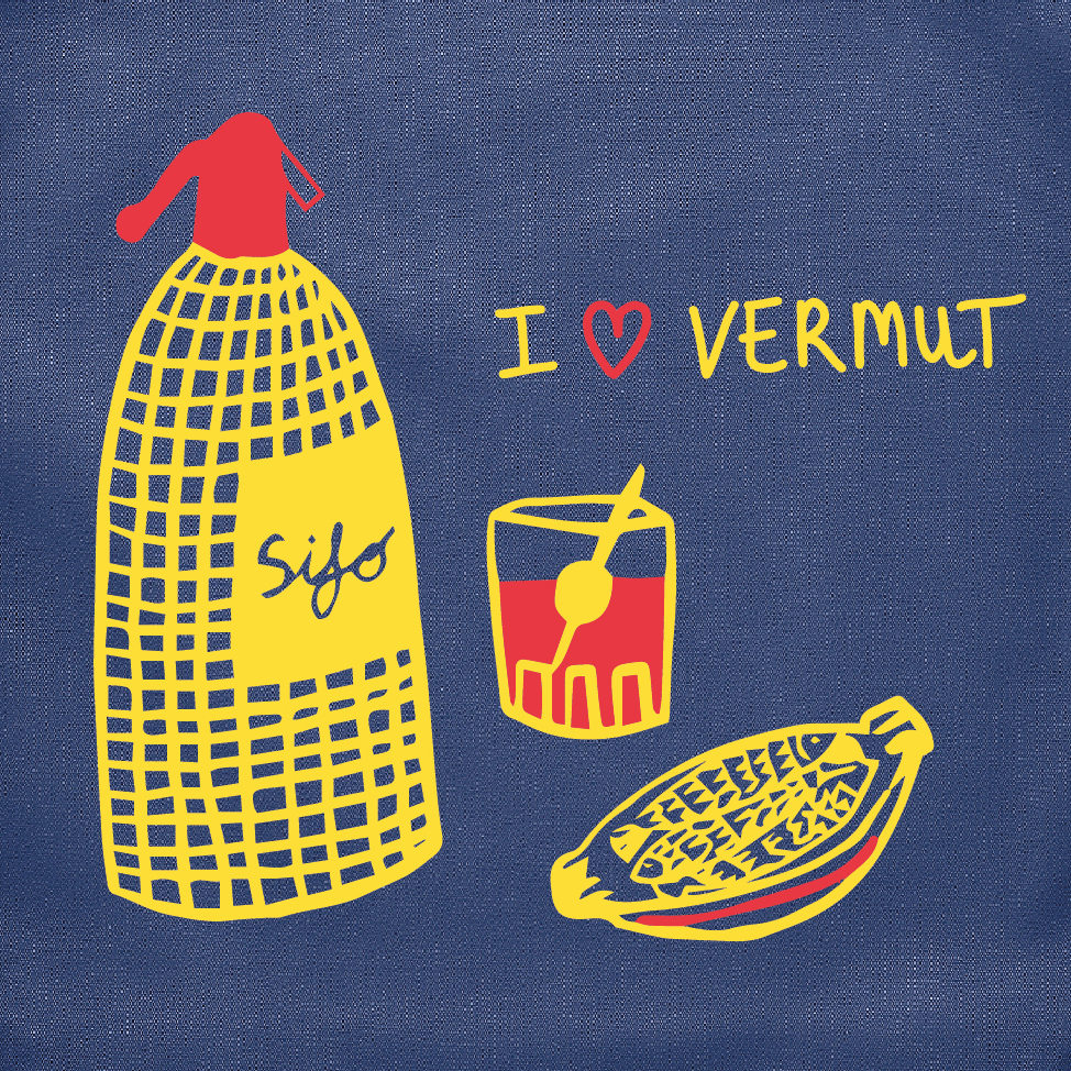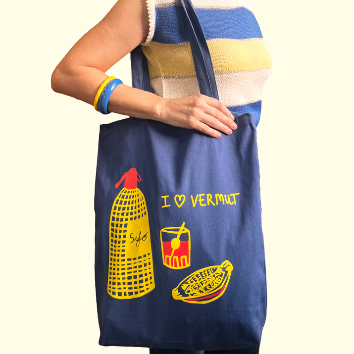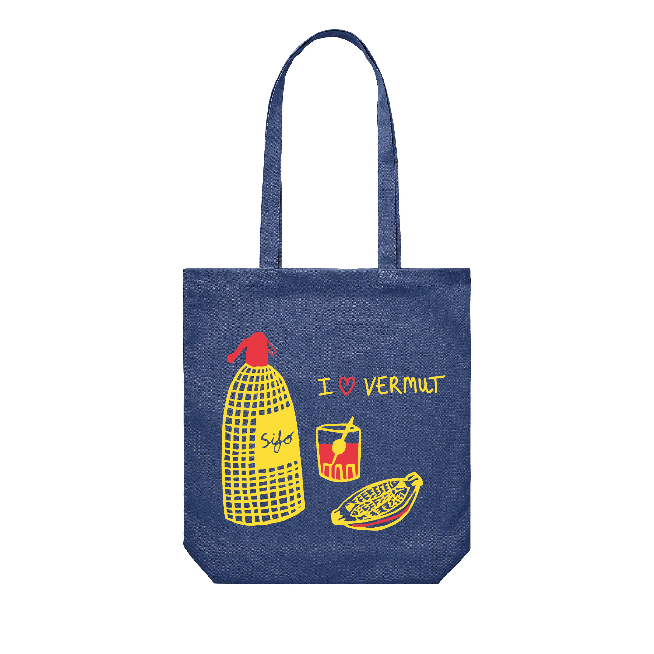 Bolsa de tela (tote bag) azul para las amantes del vermut del domingo.